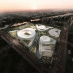 All three stadiums are topped by conspicuous undulating roofs that make the ensemble into a landmark visible from afar. In addition, the succinct character of the ensemble is reinforced by a uniform façade design: the façades of both the stadiums and the podiums are structured by horizontal lines which follow the shape of the buildings in elegant curves.