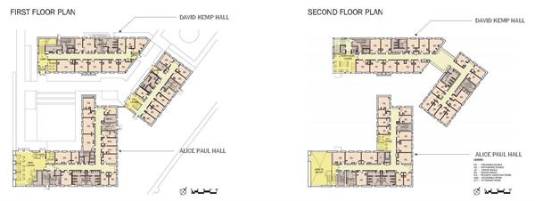 William Rawn Architects, Associates designed two separate volumes that wrap three sides of a courtyard and open to the main lawn. Each building has strategically placed double-height entries, wide corridors and communal spaces, and a combination of single and double unit types.