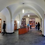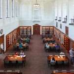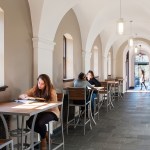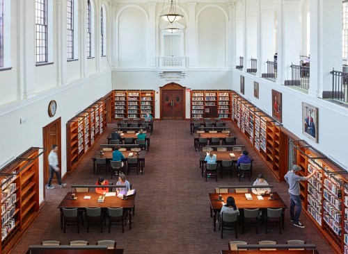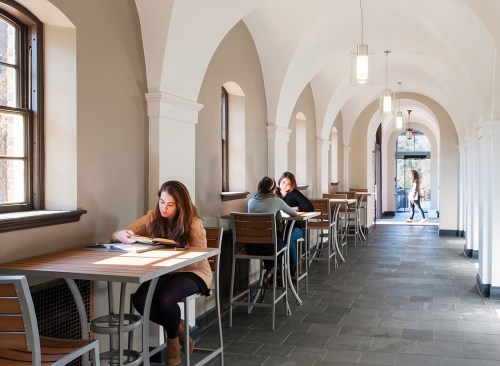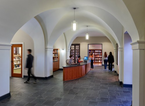 Compact shelving, hidden below the new west terrace addition, pulls the bulk of the collection out of the core of the historic building – opening up the original architecture and restoring the grandeur of the 1929 spaces. A vaulted gallery along the front of the entry façade has been reopened as a 24-hour study area with student art adorning the arcade’s niches.