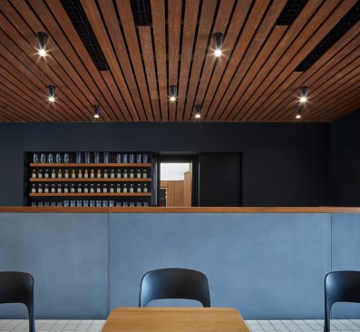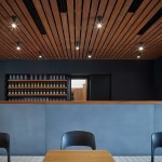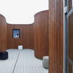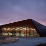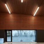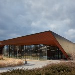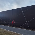 The whole object is dressed in a classy black colour. Inside, thanks to rich wood panelling, it makes for a very pleasant and warm feeling. Material contrast works on a similar principle as the glass shell – with the contrast of two different worlds: outside/inside. The significant advance of the roof on the southern façade protects from the bright sun in the summer months and gives the whole building the appropriate dynamics together with the side walls in an inclined shape. This inclination is another proof of the local terrain’s influence on the building, which becomes part of the environment.