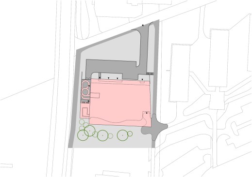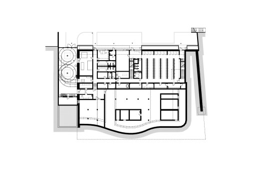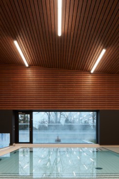 Moreover, the object makes appropriate use of the local terrain fault, which arose during the construction of the previous pool and forms a document of violent construction intervention. By correctly turning the new building and bringing it to this fault, the original wound healed, and the volume of excavation work was significantly reduced. In addition, both floors of the new building are accessible from the ground and have a smaller volume due to the specific shape of the building, on a more pleasant scale for humans.