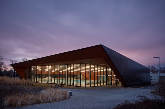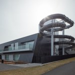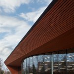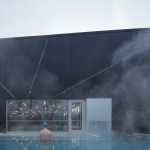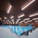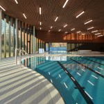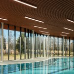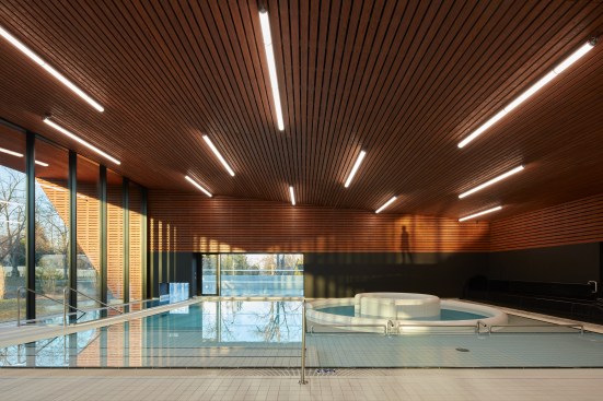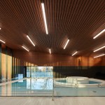 The marked contrast between the outdoor and indoor areas of the pool (especially in winter, when passers-by are buried in their coats in freezing weather, while half-naked people are frolicking in the pool hall at pleasant temperatures) is so strong that the glass shell itself has rippled as a result of these two worlds differences. In these curves you can also find the image of rippled water level in the pools or the curves of the nearby hills, which have inspired many local artists. For this impressive solution, considerably elevated glass panes reaching almost 7 meters were used, and even the load-bearing structure of the façade does not divide this glass veil by any horizontal rung. The floor plan then bends significantly into the interior of the building at the point of the main entrance. The presented shape uniqueness is taken over by the edges of the indoor pools, which makes it possible to create a space for a pool staircase, making the pool better accessible even for movement impaired visitors.
