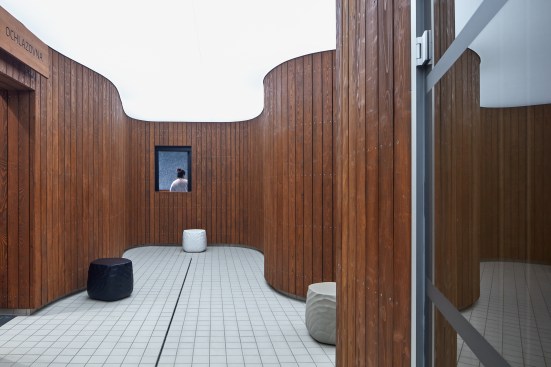 The central area of the whole building is a sauna bar, which connects two main parts, namely the water world and spa. The bar is a place to meet and relax and a starting point for further wandering through the building. All the main features of the public swimming hall are on the entrance floor, except for the access to the water slide, to which you need to climb the stairs located in a tower with a dominant raised window situated at the very top of the building and overlooking the unique relief of the landscape.