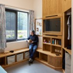Whilst use of the common spaces is actively encouraged, it was acknowledged that this patient group may choose to spend time in their own room, particularly in the morning and evening. To promote personal wellbeing, bedrooms are arranged to face outwards, with views to the surrounding mature woodland. To maximise the opportunity for activity, the bespoke fitted furniture has been designed to assist with a personal workout outside of scheduled recreation time.