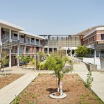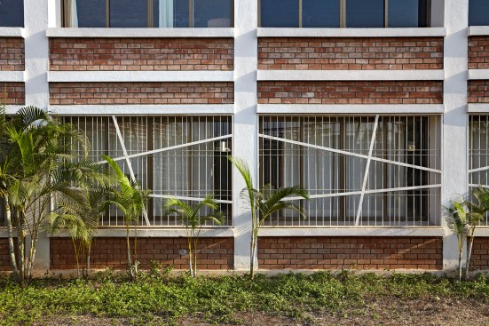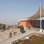 The use of energy efficient materials and inventive construction techniques significantly reduced the carbon footprint of the project. Sundried Compressed earth bricks (CEB) used in the façade of all the buildings were manufactured on site with local soil, reducing the carbon foot print of the project. A palette of naturally and locally available stones such as Kota, Granite and Shahabad has been used for flooring and wall cladding in interior areas. The local stones excavated from the site during cutting and filling was reused for the building foundations and retaining walls. The framework of the roofing systems is formed by recyclable steel members, while the exterior façade’s double height glazing that encloses learning spaces allows for the ingress of natural glare free light.