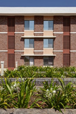 The hostels have a welcoming entrance with screens of a brickwork that provide adequate ventilation and add to privacy from the main road through their landscaped trellis’. A majority of the hostel rooms face the East and West for sunlight bring in positive energy. Singly loaded corridors keep the interiors of the hostel building porous, well-lit and safe.