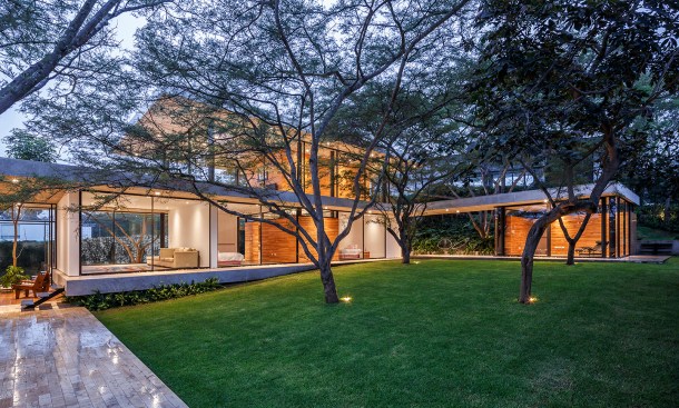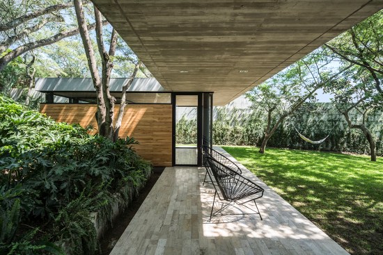 Tacuri is a place located in the Nayón area of the city of Quito. It is a fascinating place due to its microclimate, flora, fauna and exceptional view of the Cumbayá Valley. The Algarrobo tree, an endemic local species, grows all around. The trees attract so many singing birds that one can’t help but feel that they are a part of nature, despite the fact that Tacuri is just a few minutes away from urban activity. It is precisely in this site that the Tacuri House resides, and also from which it gets its name. As a single-family house, it was designed with the purpose of creating a home. The product of substantial analysis, Tacuri House respects the natural environment of its lot and draws inspiration from the surrounding Algarrobo trees; giving place to the architectural concept: “living amongst the trees.” This concept materialized in the construction process through adapting to the natural topography and keeping all of the Algarrobos on site. The result is a timeless house that feels as if it has grown from nature itself. Tacuri House is distributed along the perimeter of the lot in three different features around the main courtyard. As a result, nature, which is another source of inspiration, is integrated into all spaces and connects the entire family. The first structure, located along the street, forms the front of the property and contains all the social spaces. A second structure, distributed in two floors and located perpendicular to the first one, consists of family and private spaces. Finally, the third building is a study that overlooks the main courtyard. These three structures are connected through a continuous exterior path that winds around the whole house. The concrete slabs resembling the trees’ foliage float and intersect one another, shaping the living spaces. The metallic columns, like tree trunks, hold the slabs together in a sophisticated adaptation to the natural topography. The glass, a significant factor in this project, serves to contain the interior spaces while maintaining a direct relationship to the natural surroundings. With the help of the wood lining on all the services, the house constantly keeps a comfortable temperature. Tacuri House is a project that invites you to live an experience—the experience of architecture.