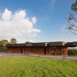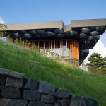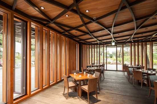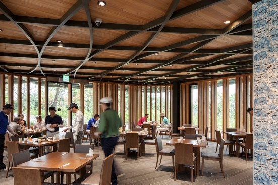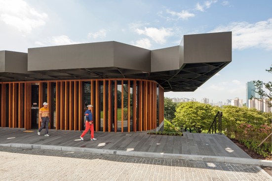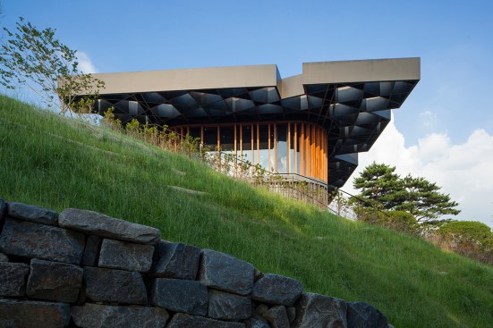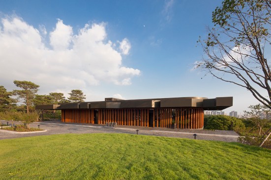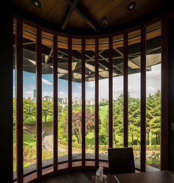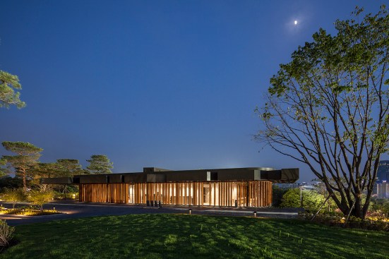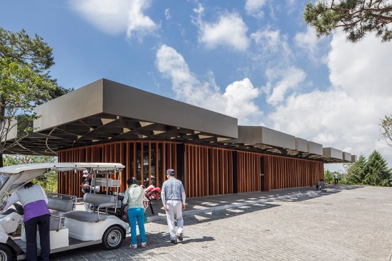Taekwang Country Club is a 36-hole golf course located just outside of Seoul. The new two-floor café is nestled in a steep hill, acting as a visual point of reference on the course. Responding to the mountainous Korean landscape and local vegetation, the building is well-integrated into its environment. Players are treated to different views of the café across the golf course, even though it is never visible in its entirety.