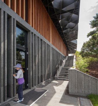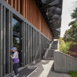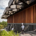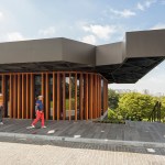 The expressive oversized black steel roof with a distinct pattern of interlocking circles produces a generous all-sided canopy. Voids in the roof allow trees to extend above the building and filter the sunlight to create a calm and peaceful atmosphere inside. The pattern of circles is continued on the ceiling of the café for a visually coherent approach.