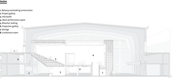 Program: The conversion of an unused hangar into a temporary information center. The design includes a two-story freestanding pavilion inserted into the hangar space with performance and exhibition venues for displaying the plans to transform the old airport. An elevated terrace will overlook the larger project’s construction.