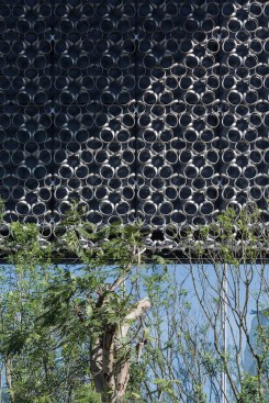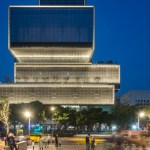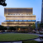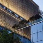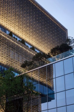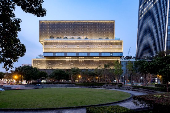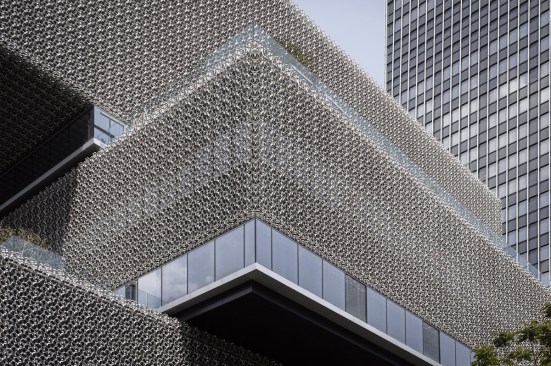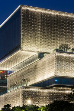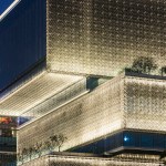 The “Retail Annex” is comprised of three large cubes offset in alternating layers, like hands placed on top of one another. The entire façade is covered with an artistic, three-dimensional cast-stainless-steel motif of plum blossoms, the national flower of Taiwan. The building makes abundant use of other handmade decorative elements as well, which are intended to inspire appreciation of craftsmanship. The “Cultural Entrance Annex” has a trussed shell whose sculptural form seems to invite people in with outstretched hands.