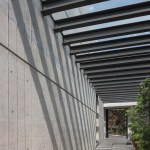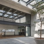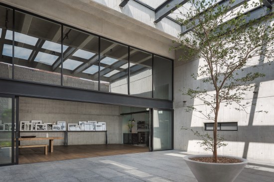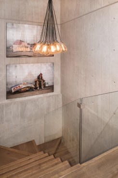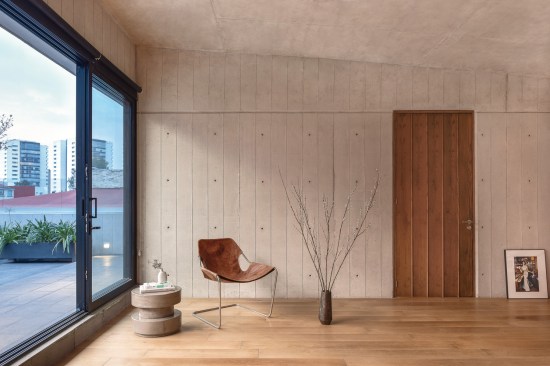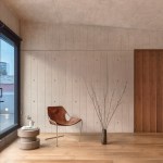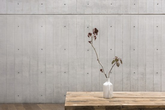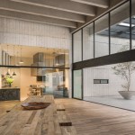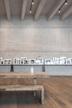 The material palette of the project strikes a balance between achieving an expressive, modern design and a simple backdrop appropriate for any use. Board-formed concrete, exposed beams, and weathered wood floors express the construction technique while emphasizing the double-height scale of the main space. The patterning achieved by the formwork, which is carried from outside to inside, is also reflected in the wood doors and interior wood cladding at mezzanine level to provide a continuous motif and is a visual play on the limited palette.