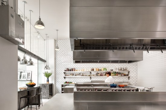 A generous use of glass appears throughout the building to provide separation of space, while maintaining sightlines. Following the Mexican processional tradition, both event spaces have their own outdoor and indoor spaces, separated by large sliding doors while the display kitchen also features glass doors to convey cooking as performance and part of the presentation. A large glass canopy semi-encloses the outdoor courtyard to allow daylight and fresh air, protect guests from the elements, and provide a sound buffer between the upstairs and downstairs areas. This is in contrast to the building’s fortified gates, which preserve the neighborhood fabric while obscuring the dynamic programming that happens behind them.