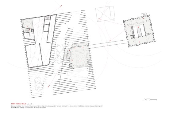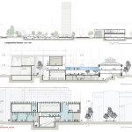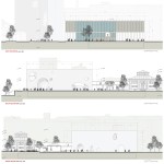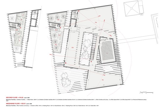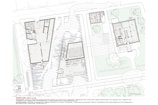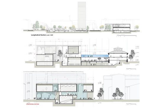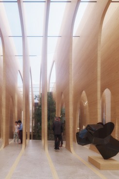 Between the timber walls there will be a strip of glass letting an ethereal diffuse light both natural or artificial coming from all directions; this will also give the right quality of light to the exhibition galleries where also a system of metal grilles, blinds, and adjustable louvers will controls the sunlight streaming into galleries letting possible also total obscurity for special exhibition needs.