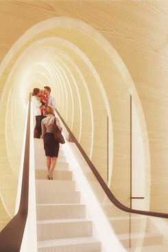 The interiors complexity and porosity will be forged not only by the parallel spaces between the wooden partitions but mainly by an abstract blob volume creating a cavernous continuous space to be subtracted from the wooden blades. This cavernous space so created is a continuous interstice that will magnificently represent and spatially stimulate the fluidity of the circulation stream. From the entrance where the “flow volume” will create a visible abstract tunnel that will dynamically become very high inside the foyer and then relatively narrow in the next space of the escalator. This continuous expansion and compression of the space will guide the visitor and define the importance of each area making also an incredible spatial stimulation during the visit. The path is studied so to have always the best views on the park, the old museum and Pyynikintori square and to always encourage curiosity and create this longing to discover what’s hidden behind next partition.