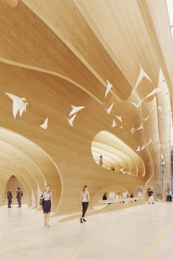 Glulam it’s for sure an incredible green choice for the low transportation and handling costs, the great insulation properties and is made of timber, that basically grows out of the ground and does not need to be mined and subjected to the high energy demand manufacturing processes that steel and cement require; and even if the space is very abstract timber will create a warm and comfortable feeling.
