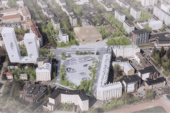 The same logic of fluid paths and blob subtraction will be applied also in the rest of the masterplan design, so to have everywhere the same architectural language. From the infill volumes to the Pyynikintori square surface, everything will be perforated by those abstract volumes. In this way the square will have holes looking to the underground parking where trees plantation will be possible, and the infill facades will have suspended courts voids to let the horizontal light go more deep inside the buildings.