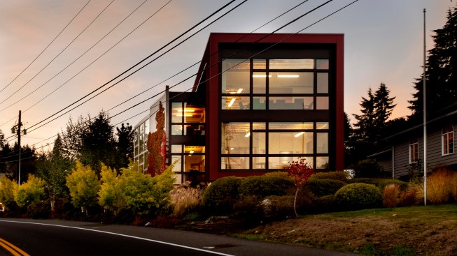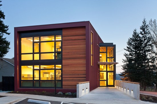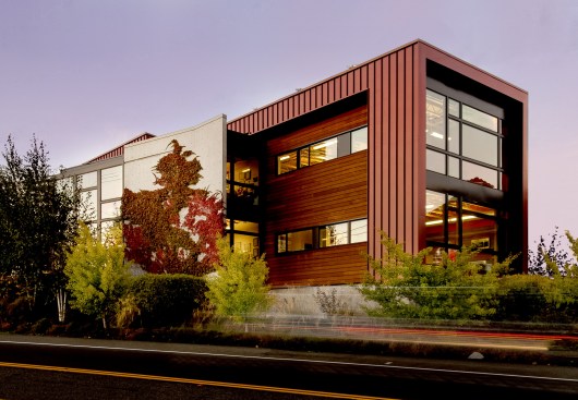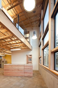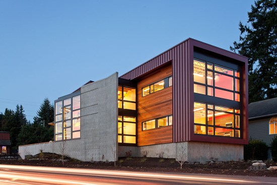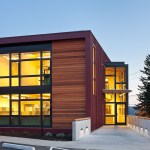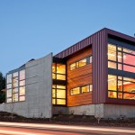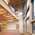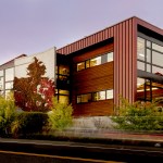 Situated on a prominent site, this 6000 sf building is a highly visible landmark in its growing community. The building’s rectangular form is punctuated by a two-story glass atrium that serves as the entry lobby and vertical circulation space. When the mechanically-operated shading louvers are opened and lights are turned on in the evening, this glass tower becomes a glowing beacon of warm light.