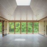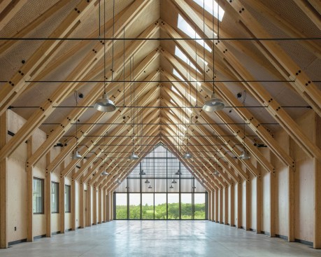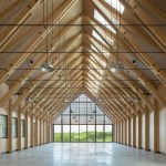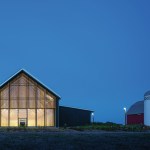 Inside are “large rooms without any interior structure,” says associate Eric Amel, AIA. A simple wood-framed, glulam truss system—sheathed in structural insulated panels—maximizes insulation while creating a soaring space that looks out to the prairie at either end. The designers doubled the number of necessary trusses—they occur every 4 feet—to create a better rhythm, a sturdier structure, and a clear reference to the framing in the historic barn.