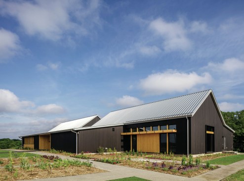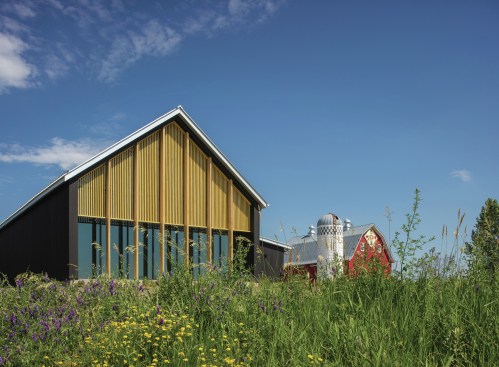 The new building defers to the only existing on-site structure: a 120-year-old red barn. “We wanted the barn to remain at the center of the campus as a historic icon,” Meyer says. Thus, the new structure, while larger in size, is lower in height; its two-tone natural finishes are intentionally more muted than the barn’s traditional red. The center’s primary structure is long and gable-roofed and runs east–west on the site, but it’s split in the center to diminish the effect of its overall mass;