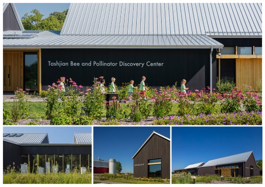 The Tashjian Bee and Pollinator Discovery Center is a multi-functional public education facility that provides learning opportunities for children and adults about the lives of bees and other pollinators, their agricultural and ecological importance, and the essential, fascinating and delicious ways our human lives intersect with theirs. Serving as the outreach arm of the University of Minnesota’s Bee and Pollinator Research Lab, this new 6,700 square-foot center contains exhibit space, a multi-purpose learning lab, a demonstration apiary, and a honey extraction room. The design connects each interior program space to demonstration pollinator gardens, beehives and future food production plots.