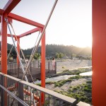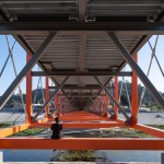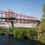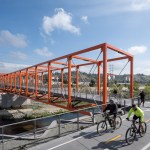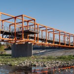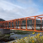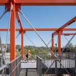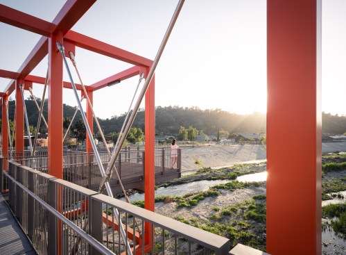 Influenced by classic railway bridges and the mid-20th century Los Angeles Case Study Houses, the simple geometric design and deliberate choice to employ the lightest structural elements possible (tube steel, wide flange steel, and steel rods) create the impression that the bright orange bridge simply “floats” across the river.