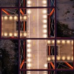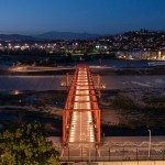 The architecture of Rumblefish is uncomplicated, essentially the visual equivalent to an oversized box truss sloping from east to west. Like the bridge’s overall design, the connecting river path similarly seems to “float” within the steel beam medley, as the walkway tilts to meet the different elevations of the banks while the exterior structure itself remains level. This track is an extension of the roads and walkways on terra firma and is the representation of the city’s path as it passes over the bridge—the truss is there to simply hold this path in place.