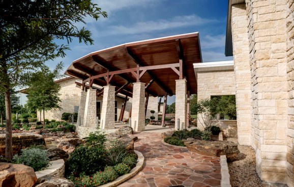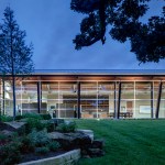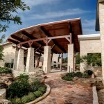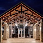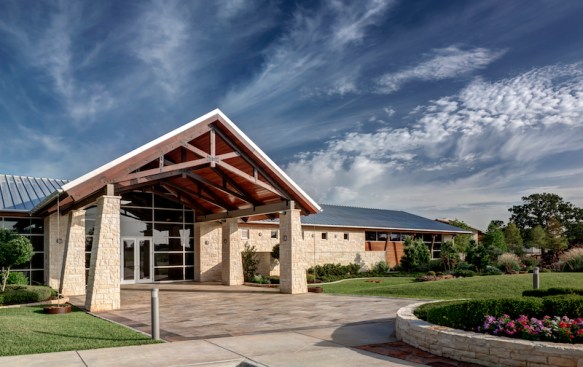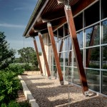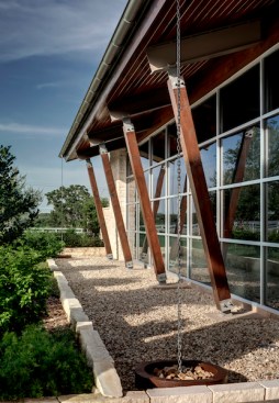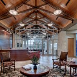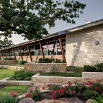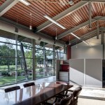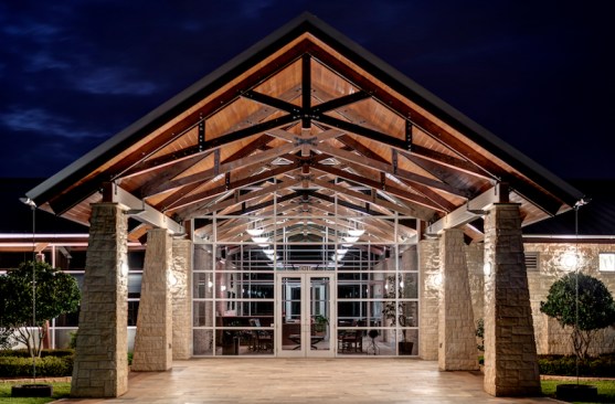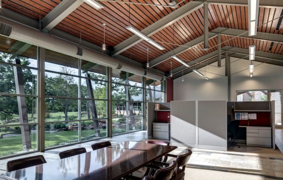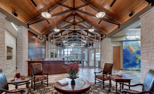 Phase Two included the heart of the headquarters: office and laboratory buildings. The office has a modern architectural character rooted in Texas vernacular, featuring clean lines, simple massing, and wide overhangs protecting wide extents of soft green glazing. Exterior finishes are a textural contrast of limestone, dark wood, and a galvanized metal roof. Leaning timber support posts and a scissor-truss covered entry create a dynamic composition. The prominent cross-gable entry element extends through the entire building to a rear covered entertainment pavilion. In between, the wood ceiling finishes and timber trusses link outside with inside, culminating in a transparent conference space.