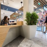 Throughout the office space, cement-like tiles were chosen to recreate the streets of the city, combining urban outdoor spaces with the functional requirements of an office. In the working areas of the office, carpets were used to create a feeling of warmth and of home, reflecting the company’s culture of treating its workers as a family.