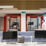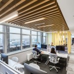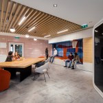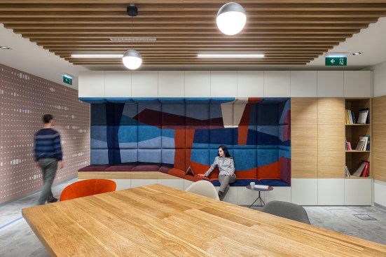 RMJM found unique and interesting ways to link their design to the office’s situation in Belgrade. The employee lockers are decorated with photographs of windows from the city, with the interior of the doors adorned with architectural sketches of these windows. Across the ceiling, the combination of natural stained and blue wood represent the paths and convergence of the two rivers of Belgrade; the Danube and Sava.
