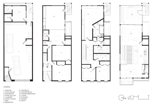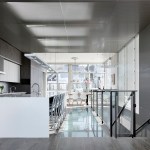 To open up to views and light, the entire upper level is now composed of one great room with windows on three sides. A translucent floor panel above the second floor landing/gallery and a perforated metal screen that wraps from the ceiling of the top floor down to the entry illuminate the entire stair hall with diffused light. The stairway itself incorporates wood, steel and glass and the perforated metal panel creates textural and visual continuity between floors, and these elements pull visitors up through the space to the main floor.