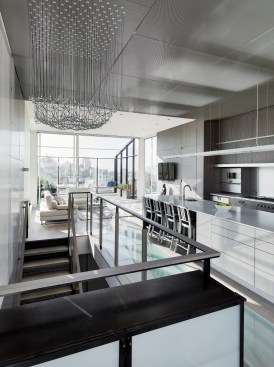 Inspired by clients who love to cook and entertain, the open kitchen was customized to function well without interfering with the serenity and flow of the space as a whole. Deep, pull out cupboards maximize accessible storage and extra deep counters feature pockets to hide appliances, dishes, cookware, and utensils to maintain a clean line that compliments the open plan.