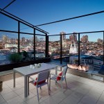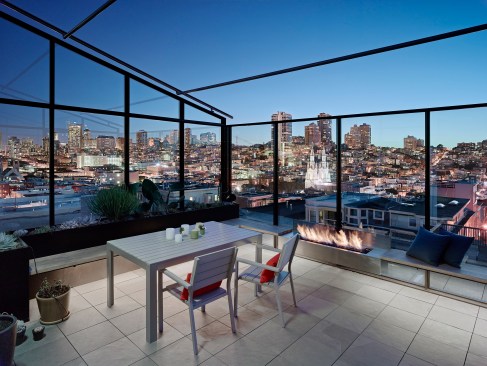 The third floor envelope was pulled back from the main façade to allow for planters to grow herbs and a small outdoor deck off the dining room for grilling. The main deck takes advantage of the sweeping views and serves as an outdoor room with fireplace, windscreen, custom planters, and an operable awning.