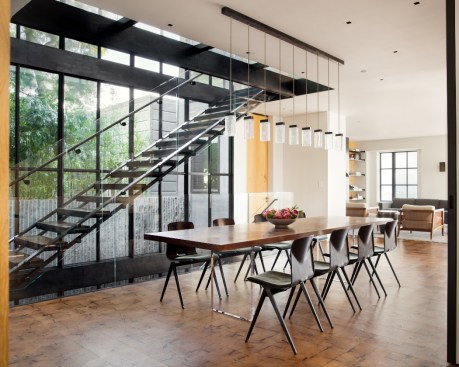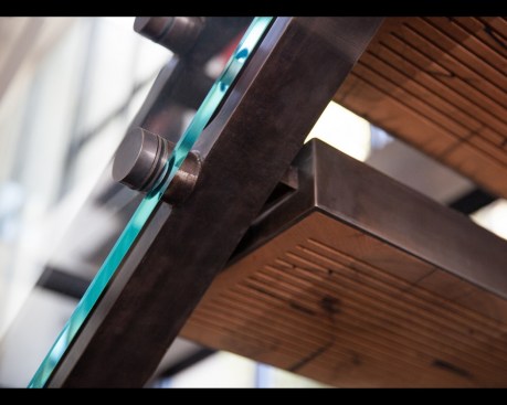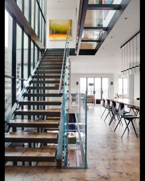 Lundberg cites this feature as one of his favorite parts of the design, saying that it’s “modern and old-fashioned all at once.” The juxtaposition works so well in part because as the clearspan staircase never actually touches the glass wall, so no vibration is transmitted from the stairs, he adds.