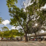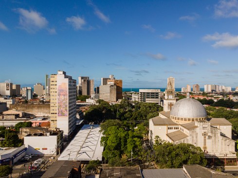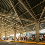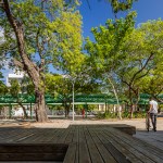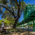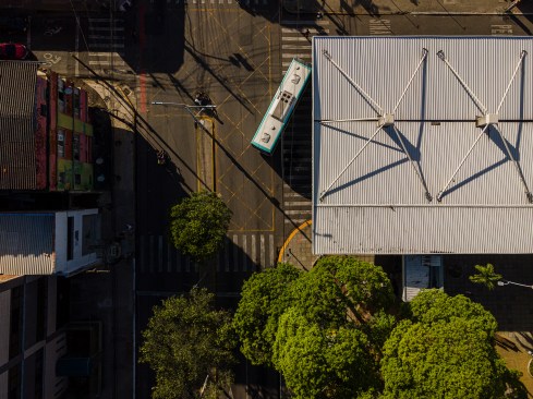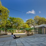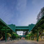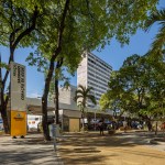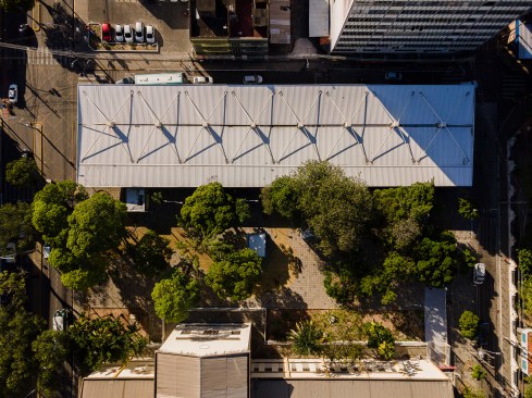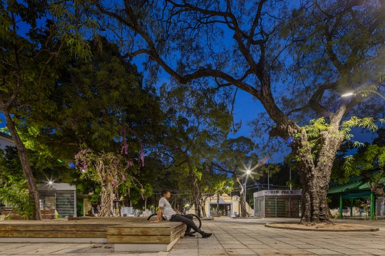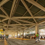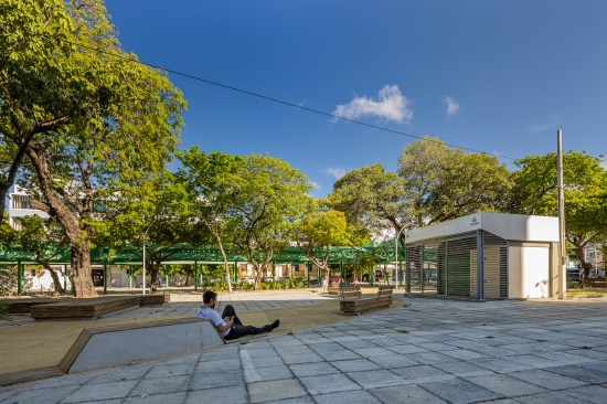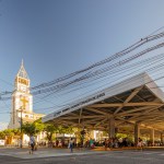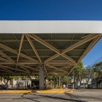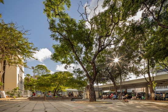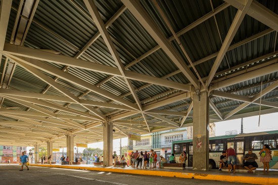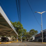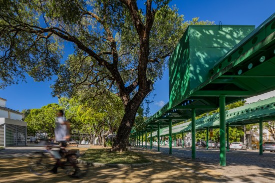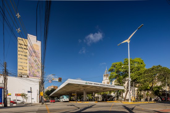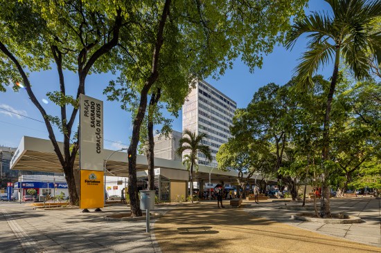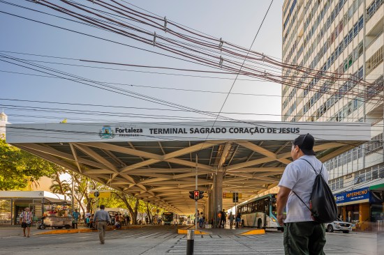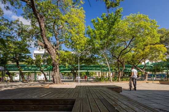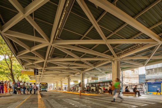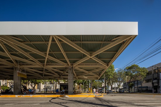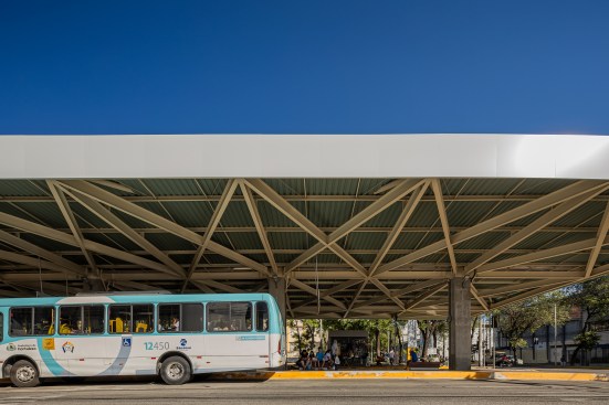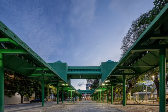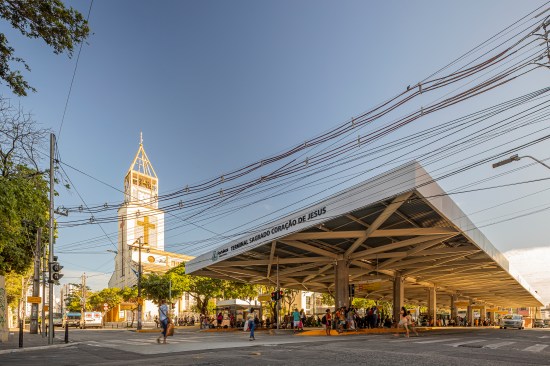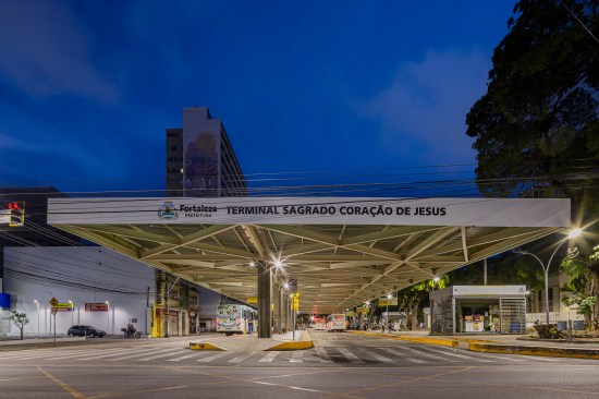 Conceived as part of the winning proposal of the National Ideas Competition, promoted by Fortaleza City Hall, which presented the requalification of approximately 40,000m² of public spaces dating back to the beginning of the last century, with the aim of making them inviting within a heritage context in the city’s historic center, the projects for the Bus Terminal and Square Sagrado Coração de Jesus had a special emphasis on their relationship with the Sanctuary (1964), and especially with the memory and integration with Parque da Liberdade – Cidade da Criança (1890), listed as a heritage site in 1993. The author team realized the need for greater comfort for bus users in an area where, according to data from the Fortaleza Urban Transport Company (ETUFOR), there were approximately 6,000 boardings/disembarkation per hour, making it an essential connection point between the center and other areas of the city. It was strictly necessary to modernize the region’s mobility infrastructure, but also to understand the urban context and the importance of that region for the memory of the people of Fortaleza. The structure needed to be fully integrated into the redevelopment project of a historic square (1880), within the immediate surroundings of a listed urban park. The design of the terminal is intentionally light and minimalist and combines the function of modernizing the infrastructure with a deep respect for the historic center in which it is located, by integrating harmoniously with its surroundings. The roof is made of a metal structure, with its X-shaped beams, purlins and bracing standing out, forming an imposing structural span that is now a landmark of the city center. The supporting pillars of the roof are made of reinforced concrete and form a single structural axis where steel tubes connect and throw large overhangs of 7 and 14m. The metal tile sandwich panel´s roof slopes towards the center, directly connected to the pillars. The new, modern open passenger terminal on Solon Pinheiro Street replaces the old steel roofs, restored in the project and relocated to Jaime Benévolo Street (parallel), based on the understanding of the need to preserve part of the visual identity of the surroundings, due to the striking design of these old structures, thus forming a proposal for a corridor for pedestrian activities on a stone road that was elevated and agglutinated as a public space in the square, thus forming a new pedestrian street where cars used to travel. The Sagrado Coração de Jesus square was completely paved with drainage paving slabs and an organic strip of flooring that integrates it directly into Parque da Liberdade. Its trees were completely preserved, but their gardens were rearranged from a radial path-inducing structure to individual circular gardens, leaving the pedestrian path freer and more fluid. The square has been fully equipped with new furniture, including benches, garbage cans and large wooden tables that allow multiple uses of the public space, as well as completely new designer equipment, such as the magazine stands and the trapeze bench.