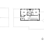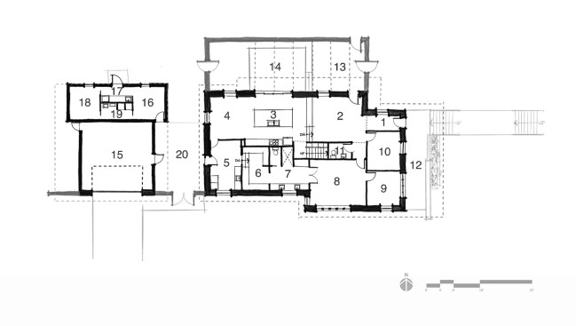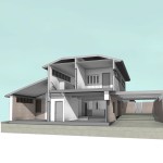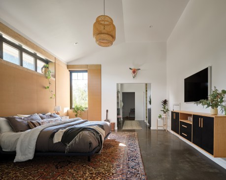 The project, completed in 2019, greets visitors with a sweeping cantilevered roof, spanning a depth of 13 feet. While the extension initially called for a steel frame, the design was simplified to wood construction. The interior features a split-level main floor and a partial second story. The kitchen and dining areas, located toward the back of the house, are raised to accommodate the slope of the site. Neutral, earthy tones of white finishes, wood accents, and concrete floors accentuate the construction. Denison chose this palette as “everything works in tandem with the texture and color” of the rammed earth walls.
