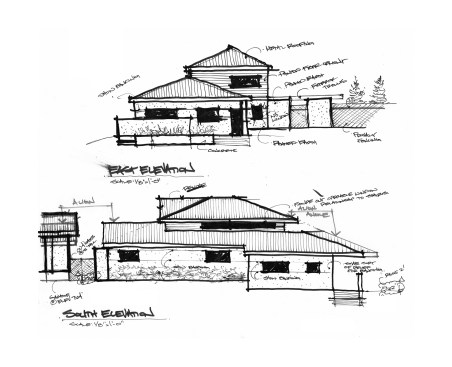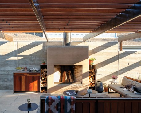 Terra Heights is one of four structures designed to accommodate a multigenerational family. Adjacent to the site is a Craftsman residence for the owner’s parents, with each property containing an on-suite attached to a garage. The two homes are linked by adjoining courtyards, providing an opportunity for public interactions among the families; however, each residence accommodates private spaces for intimate moments. The gathering space features a rammed earth fireplace and open rustic steel pergola, extending the interior earthy tones into the outdoors. Board form concrete walls assist in the division of the spaces as well as further emphasize the horizontality of the overall design. The walls of the courtyards also assist in protection from hot summers and high winds.