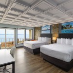 The restaurant renovation was a success, bringing new business and increased attention to the property. The Drowns are continuing with their long-term plan to remodel the entire resort and have redone about 20% of the guest rooms. They opened the exterior walls, adding glass for almost the full width and height of the room. They added ledgestone accent walls, accent lighting, hard floors, and contemporary furniture. They replaced the conventional ceiling with Ceilume thermoformed panels, which Jared Drown describes as “a bright white coffered ceiling, giving the room more height,” again using Ceilume white Madison and Cambridge panels in the existing ceiling suspension grid. They refinished the grid itself by applying slide-on grid covers to match the new panels. The effect is welcoming and warm, with a kind of livable elegance.