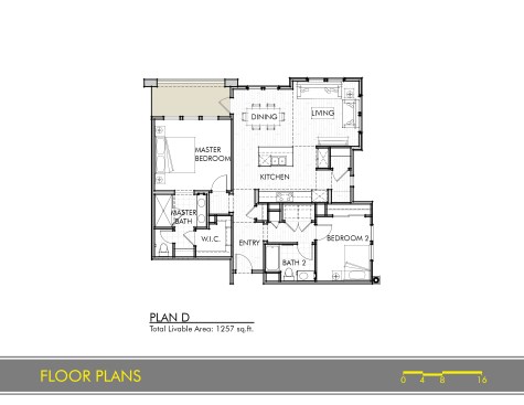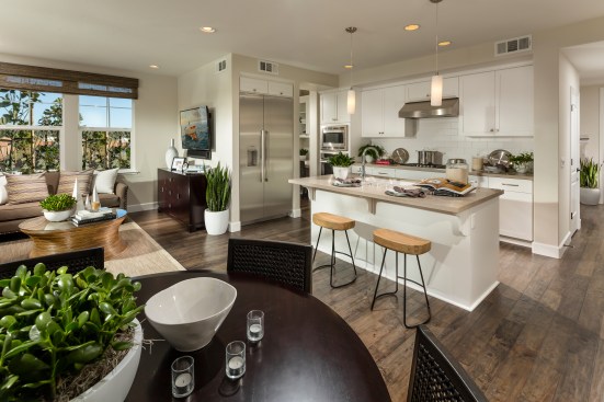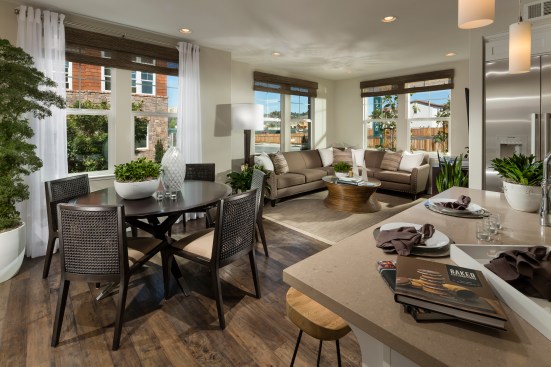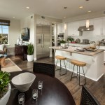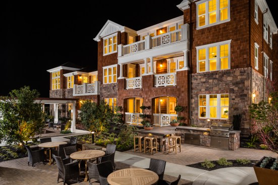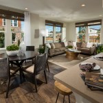 This new community of 85 residences includes three different product types: market rate single-family homes, age-restricted condominiums, and cottage-style homes. The luxury stacked flats are arranged into six building types, each of which includes an elevator and a one- or two-car garage for each home. The flats offer up to three bedrooms arranged in an open plan with private open space that has views to common open space and the mountains beyond.