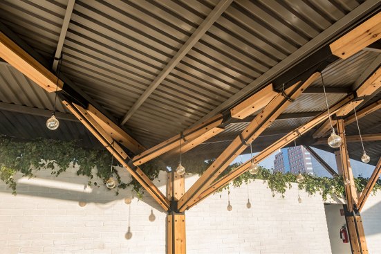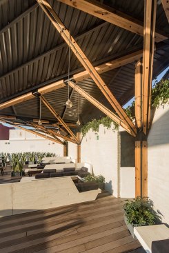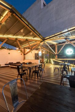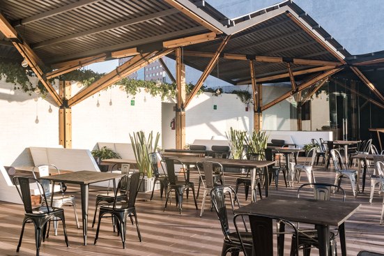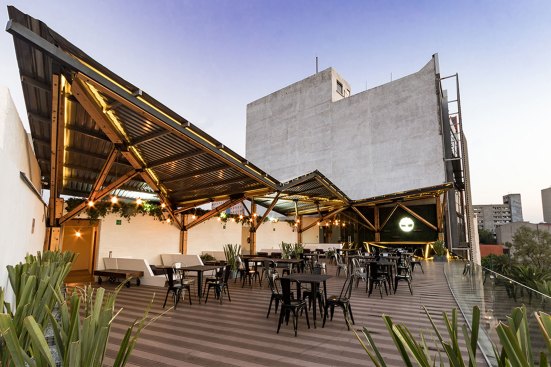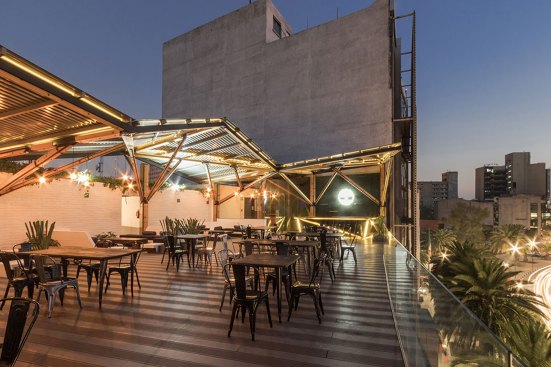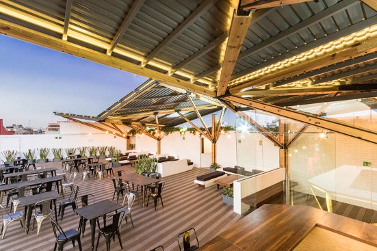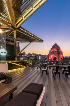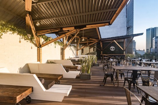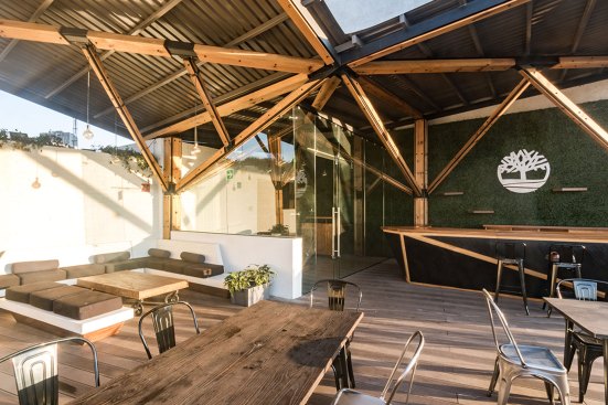 An under-used rooftop with a privileged location, in front of the Plaza de la República and the Monumento a la Revolución in Mexico City, sparked a strategic collaboration between the brand Timberland and the real estate developer Reman Holdings. Building a rooftop terrace reconciled the interests of both parts in having a venue for events and making the most of such a powerful space, to be part of the facilities of HomeWork. A-001 Taller de Arquitectura led from the beginning the coordination, project management, architectural proposition and building process. This project puts in practice an URBANKETING® concept, developed by A-001 Taller de Arquitectura, which allows companies and brands to make marketing through accountable and non-invasive urban and city projects. The formal aspect was based on the premise of potentiating the view to the Plaza, besides giving priority to a versatile functionality. Consequently, a partially covered open plan floor was proposed, which enables to host different kind of events as parties, concerts, restaurant, bar, yoga, among others. Using material such as wood, metal, zinc plated roof, an architectural language was created according to the spirit of Timberland, which is inspired by the outdoors experience. The main challenge of this project was the structural solution, since a nonexistent floor plan level was created and to do so it was necessary to extend the vertical structural elements of the building and to set up a mesh over which the terrace was built. Terraza Timberlad, being the first viewpoint to the Monumento a la Revolución, takes part in the urban revitalization of the Plaza de la República through a different way for promoting a brand: making a contribution to the city and taking advantage from disused spaces.