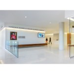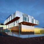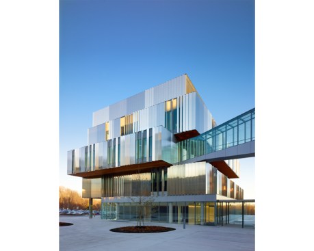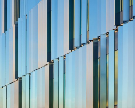 The stainless steel cladding panels follow an arithmetic sequence of angles that impose a varied appearance to the exterior that acknowledges the Campus’ natural setting and directs views from the interior for a 360 degree panorama. The faceted facades capture both natural and ambient artificial light ensuring its landmark presence is articulated 24/7.