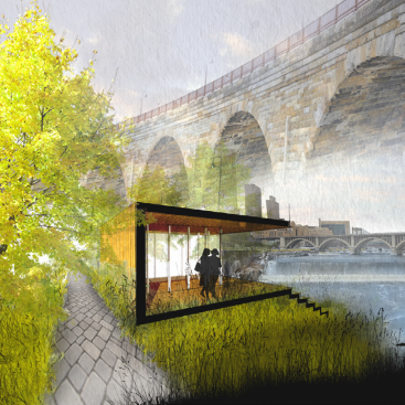 The impact of the building is spread beyond the site through the placement of 3 small outposts located at key points along the river as it flows through Minneapolis and St. Paul. Accessed by the existing walking and biking trails, each outpost offers a moment of re-connection and appreciation for the incredible variation of the river’s character while educating visitors about environmental issues. The first is located at St. Anthony Falls in downtown Minneapolis, (the largest waterfall on the Mississippi) the second is located at Mississippi Gorge Regional Park, (characterized by 100 ft tall sandstone bluffs) and the third at Harriet Island in St. Paul which is prone to flooding every spring.