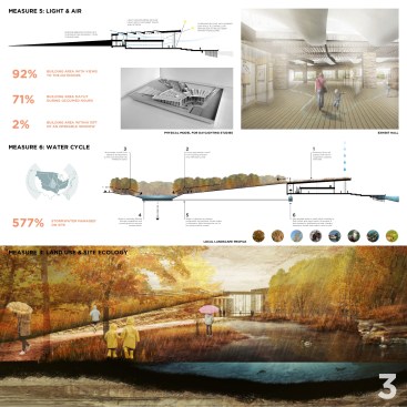 The building concept blurs the distinction between architecture and nature by developing a language of symbiosis, in which humans and nature can coexist. It is physically integrated within the restored oak savannah/wetlands and plays an integral role in the stormwater strategy of the site. The building mass buffers from winter winds and opens out to the south to maximize solar gains, while a double-skin façade helps regulate indoor temperatures and air quality. The program is organized around limiting energy use. The exhibit hall and offices, which need a generous amount of daylight, are located on the second level and take advantage of light scoops, while the event hall and research labs, needing a more controlled environment, are located on ground level.