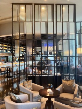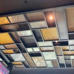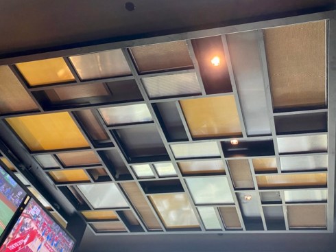 Texas Live hotel in Arlington Texas, a Loews property, designed by HKS Architects in Dallas. Pulp Studio designed the soffit glass in the Bourbon Bar, operable doors and screens with a variety of textures and mirrors.