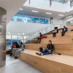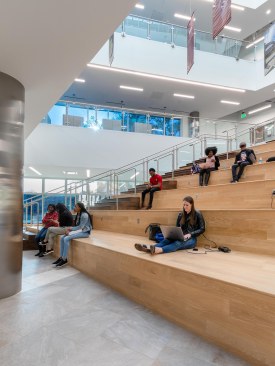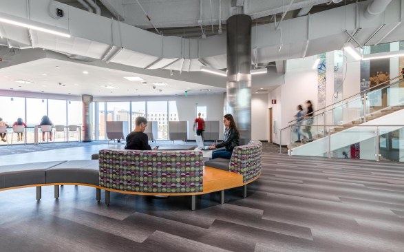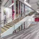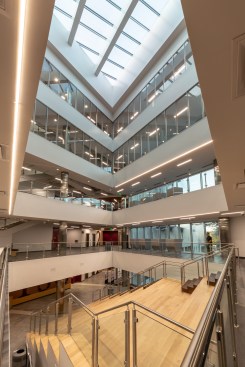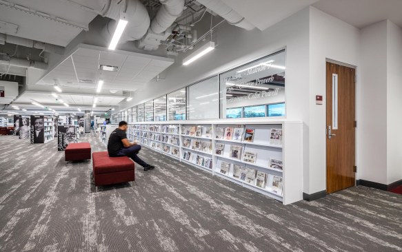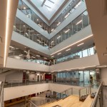 The contemporary, angular design helps draw you inward toward the main lobby space and up through a five-level atrium which serves as the heart of the building. The entire building encompasses a café, classrooms, book stacks and computer labs, study areas, offices, meeting and board rooms as well as gallery space. Additionally, it will house the TSU’s faculty senate, IT department, serve as an Honors College, and provide an alumni suite.
