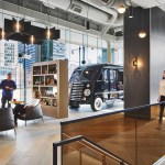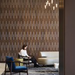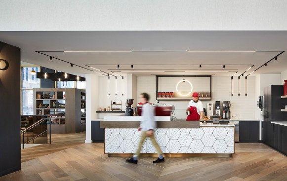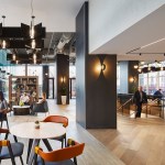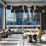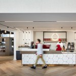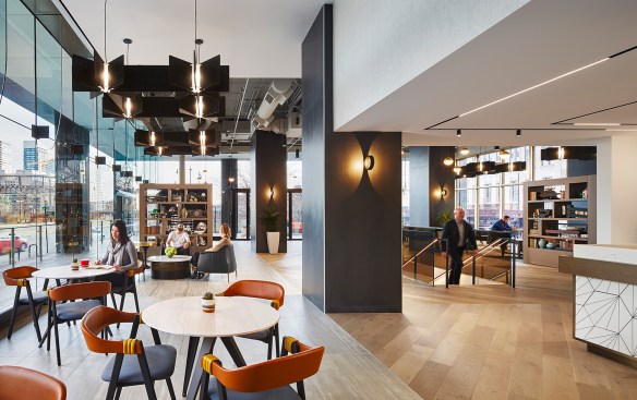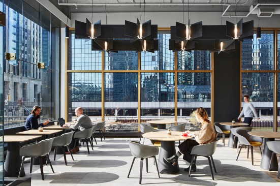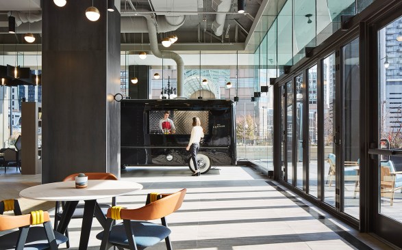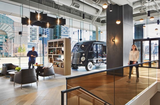 The transformation begins with the repositioning of the main entry to the center of the building, updated revolving doors and adding a timeless exterior canopy. In the dynamic public-facing lobby, soft seating areas flank a custom reception console and provide alternative work environments for tenants and visitors. The project’s highlight is found adjacent to the lobby, where a former office space is transformed into a flexible amenity lounge with views of the Chicago River, casual seating arrangements, custom bookcases, and a full-service café. Visible from the street, a unique stationary food truck serves a rotating selection of cuisines from a variety of local food purveyors