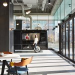 In warmer months, a renovated outdoor terrace accessed through a new retractable sliding glass wall extends the social gathering space. On a lower level, bicycle storage and a yoga/group exercise studio were added for tenants. Along with the public areas, a number of Huntsman-designed speculative tenant suites have been successful in attracting new tenants to this destination property.