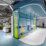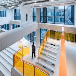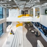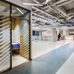 Throughout the operative zones, careful consideration ensures each of the different areas has its own distinct colors, providing clear guidance for visitors by establishing a unique visual identity for every one of the four brands that are housed under the company. Open office work stations encompass the building’s perimeter, thereby guaranteeing each employee has access to both daylight and pleasant exterior views while simultaneously promoting ‘casual collaboration’ in a bid to encourage collaboration.