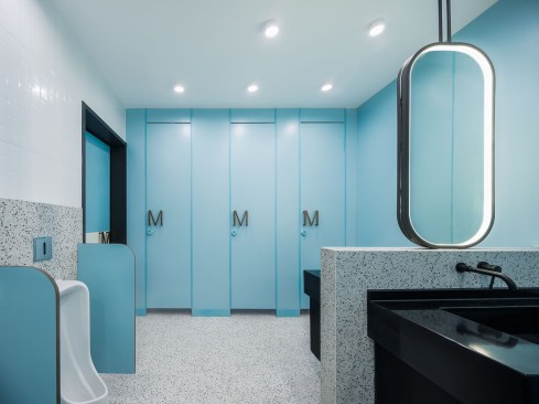 The upper two floors house the main operational areas, with the central atrium, complete with a sculptured bar area and reception desk, designed to function as the primary element, further strengthening the striking aesthetic of the interior. The unusual staircase also serves as a gathering point for temporary events and has been carefully shaped to imitate the gesture of waves, thus reinforcing the brand’s name even further, with this design feature also been applied to the bar and reception areas, albeit on a smaller scale. These are complemented by the background art installation from a local artist, thus perfectly encapsulating the brand’s DNA.