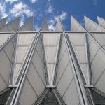 The 150-foot-tall chapel is situated on a podium adjacent to the Court of Honor. The program required three distinct chapels: a 900-seat Protestant chapel, a 500-seat Catholic chapel, and a 100-seat Jewish chapel. Each chapel has a separate entrance. The main floor Protestant chapel is enclosed by tetrahedrons clad in extruded aluminum separated by continuous colored glass panels, with windows of special laminated glass. The terrace-level Catholic chapel is characterized by precast masonry forming the ceiling pattern, with side walls of amber glass and strip windows of faceted glass. The Jewish chapel is a circular room enclosed in cypress frames and stained-glass slabs, with a foyer of brown Jerusalem stone donated by the Israeli Air Force.